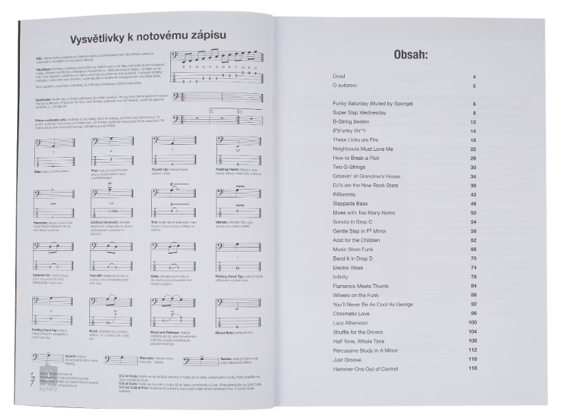 Skladby najdete v notách i tabech, nechybí QR kódy odkazující na videa a všechny kusy jsou dostupné i jako mp3 ke stažení. Většina skladeb je určena pro čtyřstrunnou baskytaru, tři pak vyžadují pětistrunný nástroj.