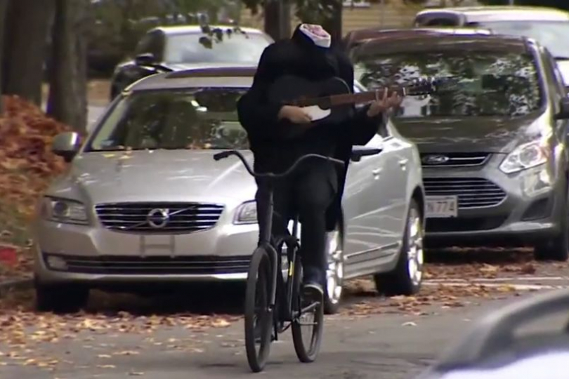 Headless kytary jsou dnes součástí nabídky řady výrobců, ale bezhlavý kytarista není k vidění každý den. V období Halloweenu mají lidé různé nápady a jeden z méně obvyklých, zato lehce rizikových, dostal muzikant Matthew Dunkle. který se v kostýmu bezhlavého jezdce projížděl na kole za plného provozu městem Concord v americkém Massachusetts, a k tomu ještě stihl hrát na akustiku.