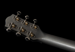 Pojďme k materiálům. Zmíněná vrchní deska je masivní smrk, zadní deska a luby jsou z laminované plané třešně, krk je ze stříbrolistého javoru a na hmatník výrobce použil richlite, což je ekologický kompozitní materiál z přírodních vláken, který se vyznačuje velkou odolností a trvanlivostí a používá se například i na stavbu lodí. Hmatník nese devatenáct skvěle ošetřených pražců, orientační značky v podobě klasických teček a intarzii na dvanácté poloze. Kobylka je z ebenu a nutý pražec z materiálu TusQ. Firemní ladící mechaniky jsou otevřené a fungují bezchybně.