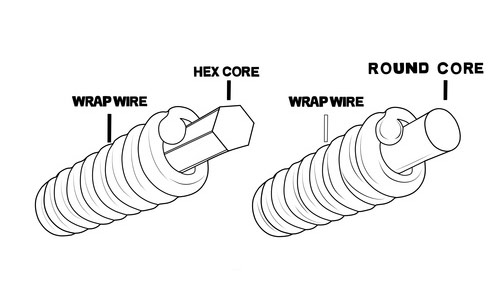Někteří výrobci tvrdí, že šestihranné jádro déle vydrží, případně že kulaté jádro dodává strunám „vintage“ zvuk. Ve skutečnosti bývá životnost obou typů srovnatelná a mnohem víc záleží na péči o struny a na stylu hry, tedy jak moc do toho „řežeme“. Rozdíly zde ale samozřejmě jsou.