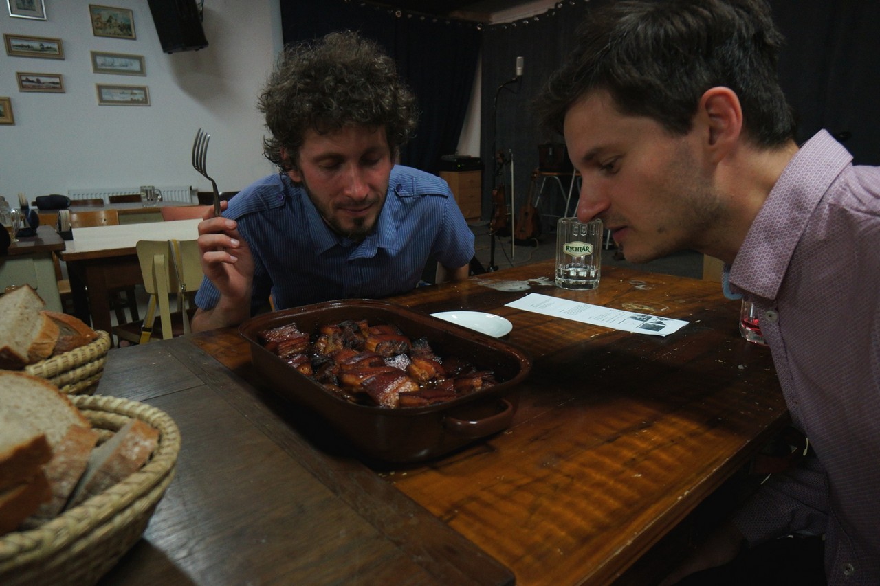 Následujícího dne jsme se zastavili v soukromém klubu v obci Potočná nedaleko Nové Bystřice. Na poměrně nepravděpodobném místě na nás čekala profesionální scéna, několik nečekaných pondělních posluchačů a po koncertě domácí bůček. Leč více si o stravování (jakož i o dalších radostech a strastech našeho putování) povíme příště.