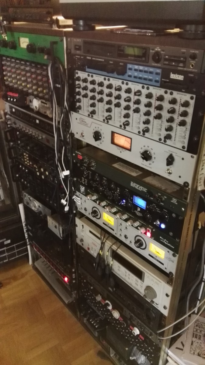 Náběry nástrojů jdou do pultu, pak jde každá stopa zvlášť do AD/DA převodníku a z těch do počítače. Když se pak míchá, tak stopy víceméně zůstanou v počítači, pokud předpokládám hodně úprav a mám málo času. Akorát připojím externí hally, třeba Lexicon 480, nebo vedle mám velký pružinový reverby od AKG. Ty hally jsou počítačově furt dost nedostižný. Když je víc času nebo míchám něco většího, tak míchám na pultu.