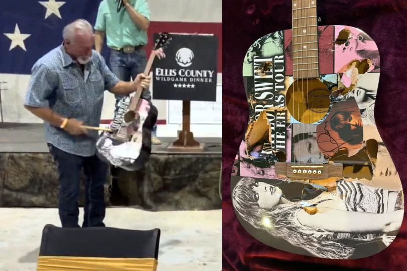 V dobročinné aukci Ellis County Wild Game Dinner, konané v texaském Waxahachie, se kromě jiných položek dražila i akustická kytara nesoucí podpis zpěvačky Taylor Swift a grafiku ve stylu její současné koncertní šňůry Eras Tour. Cena nástroje včetně poplatků sice nakonec dosáhla hranice 4000 dolarů, ale životnost funkční kytary se ukázala jako jepičí, protože „šťastný“ nový vlastník ji přímo před aukčním pódiem rozmlátil kladivem.